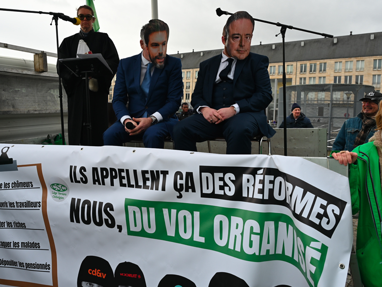 Pour l’occasion, le gouvernement Arizona - personnifié par Bart De Wever et Georges-Louis Bouchez - a été symboliquement placé sur le banc des accusés. Cette mise en scène visait à illustrer et dénoncer les conséquences concrètes des mesures associées à l’Arizona sur différents publics.